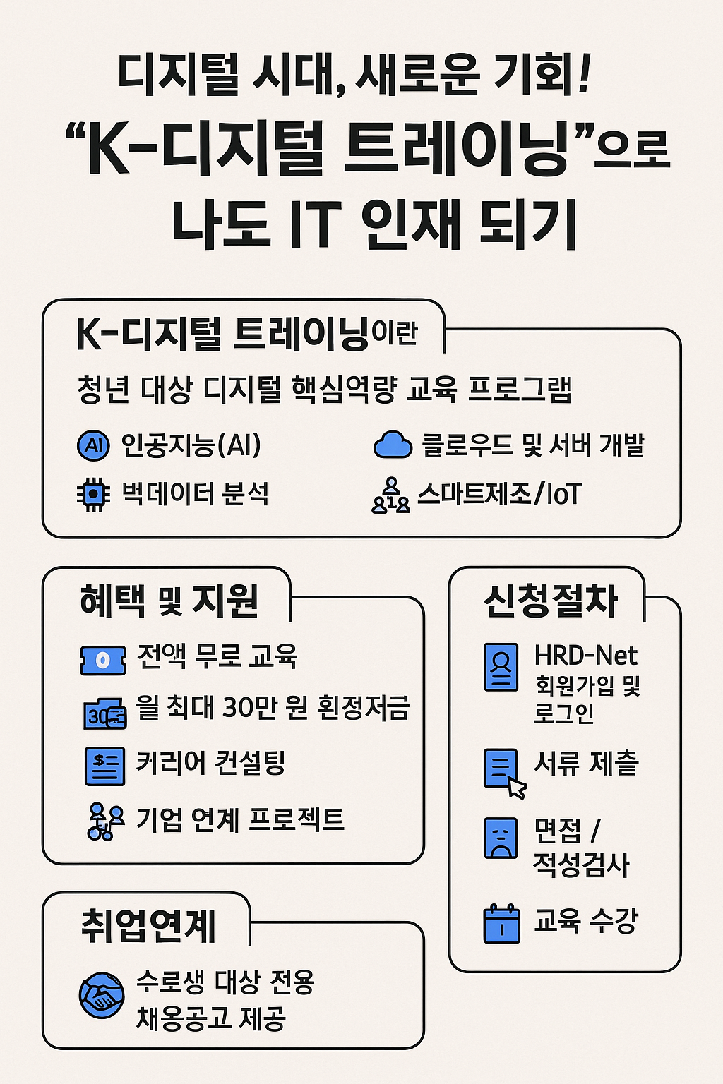 요즘처럼 빠르게 변화하는 시대, 더 이상 안정된 직업은 없습니다. 그래서 많은 분들이 주목하고 있는 것이 바로 K-디지털 트레이닝입니다.