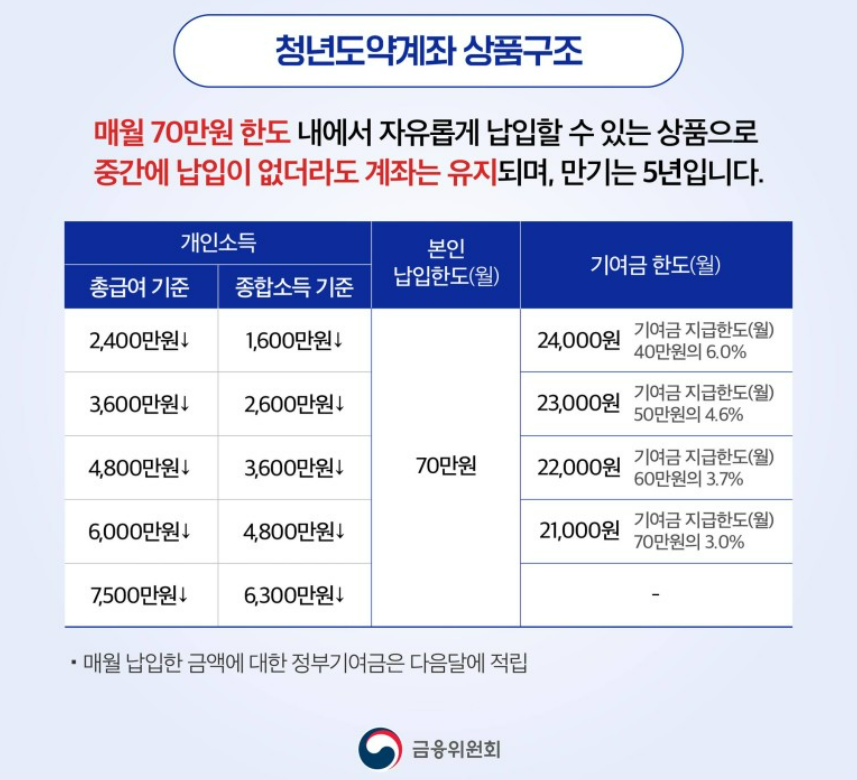 정부기여금: 개인소득 수준 및 적금 납입금액에 따라 정부기여금 지급