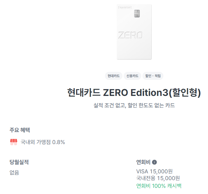 가장 먼저 현대카드의 'ZERO Edition3(할인형)카드' 는 연회비 1만5000원을 내면 전 가맹점에서 0.8%를 할인 받을 수 있다. 우리카드의 '카드의 정석 EVERY1카드' 도 연회비 1만2000원으로 국내외 가맹점에서 1%의 기본 할인에 더해서 실적에 따라 최대 2만원까지 더 할인해준다.