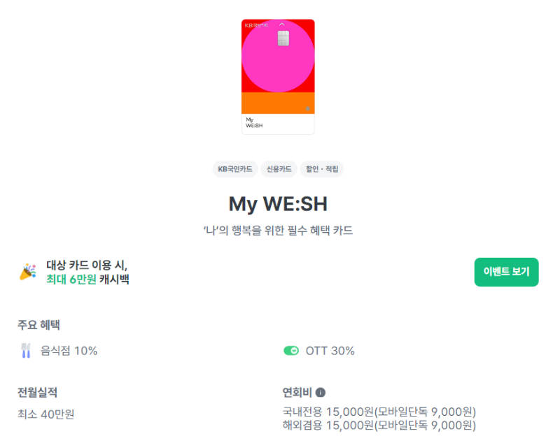 쇼핑과 문화생활을 많이 하는 소비자라면 KB국민카드의 'MY WE:SH카드' 를 선택하면 좋다. 전월에 40만원을 쓰면 음식점, 편의점, 통신비 10%, 온라인 동영상서비스(OTT) 30%, KB Pay 10% 할인을 기본 제공하고 자신이 선택한 분야에 대해 5% 할인을 추가로 제공한다.
