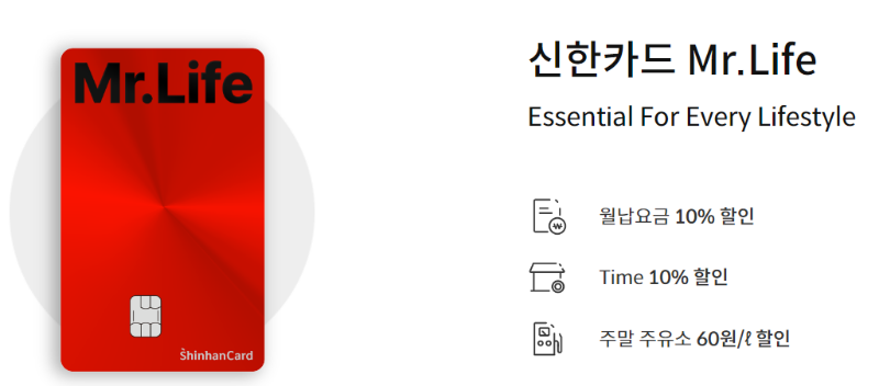 통신비, 공과금, 주유비 등 생활분야에서 소비가 많은 소비자는 신한카드의 'Mr. Life' 카드를 추천한다. 이 카드는 전월 실적 30만원이 넘으면 공과금, 마트, 편의점, 병원, 약국, 택시등의 다양한 생활업종에서 10% 할인 혜택을 제공한다.