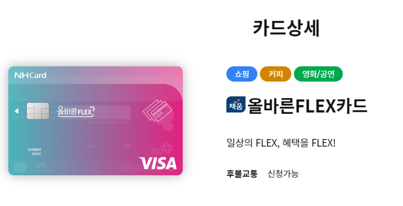 NH농협의의 '올바른 FLEX카드' 는 영화 30%, 유튜브, 넷플릭스 20%, 배달 앱 10%를 할인해줘서 젊은 층이 사용하기에 좋다. 이렇게 필요한 분야의 혜택에 특화된 카드 실적을 맞추고 나머지 결제 금액에 대해서는 무실적. 전가맹점 할인 혜택을 주는 카드를 쓰면 좋다. 다만 카드별로 연회비와 할인률이 다르기 때문에 연회비 이상으로 할인받을 수 있는 만큼 카드를 사용해야 한다.