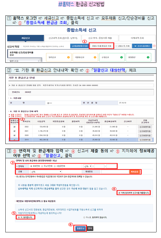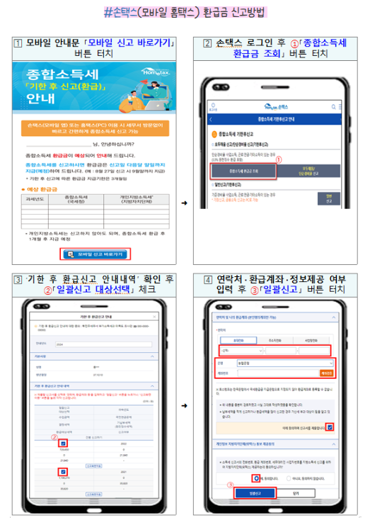 홈택스 또는 손택스 앱 로그인 → 소득세 환급 메뉴 클릭 → 정보 입력 → 신청 완료!