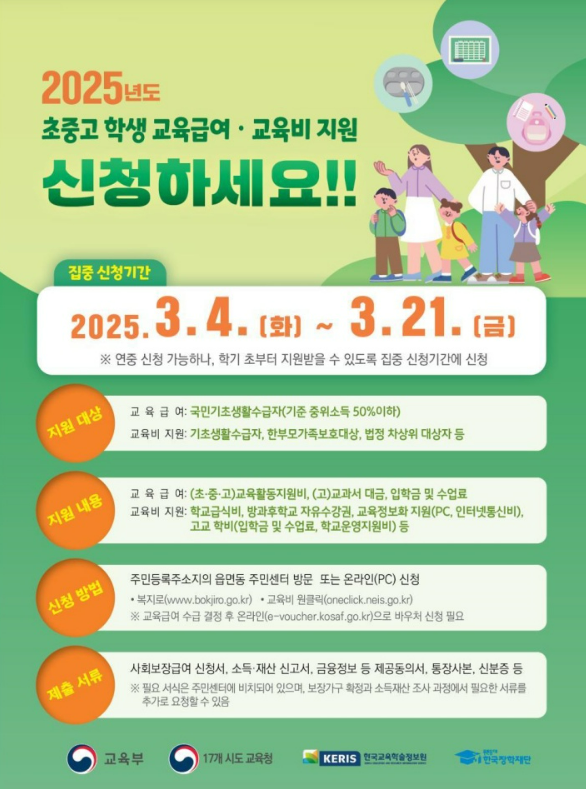 2025년 기준, 중위소득 50% 이하 가구의 학생이 신청 가능하며, 교육활동 지원비를 지급받을 수 있습니다.